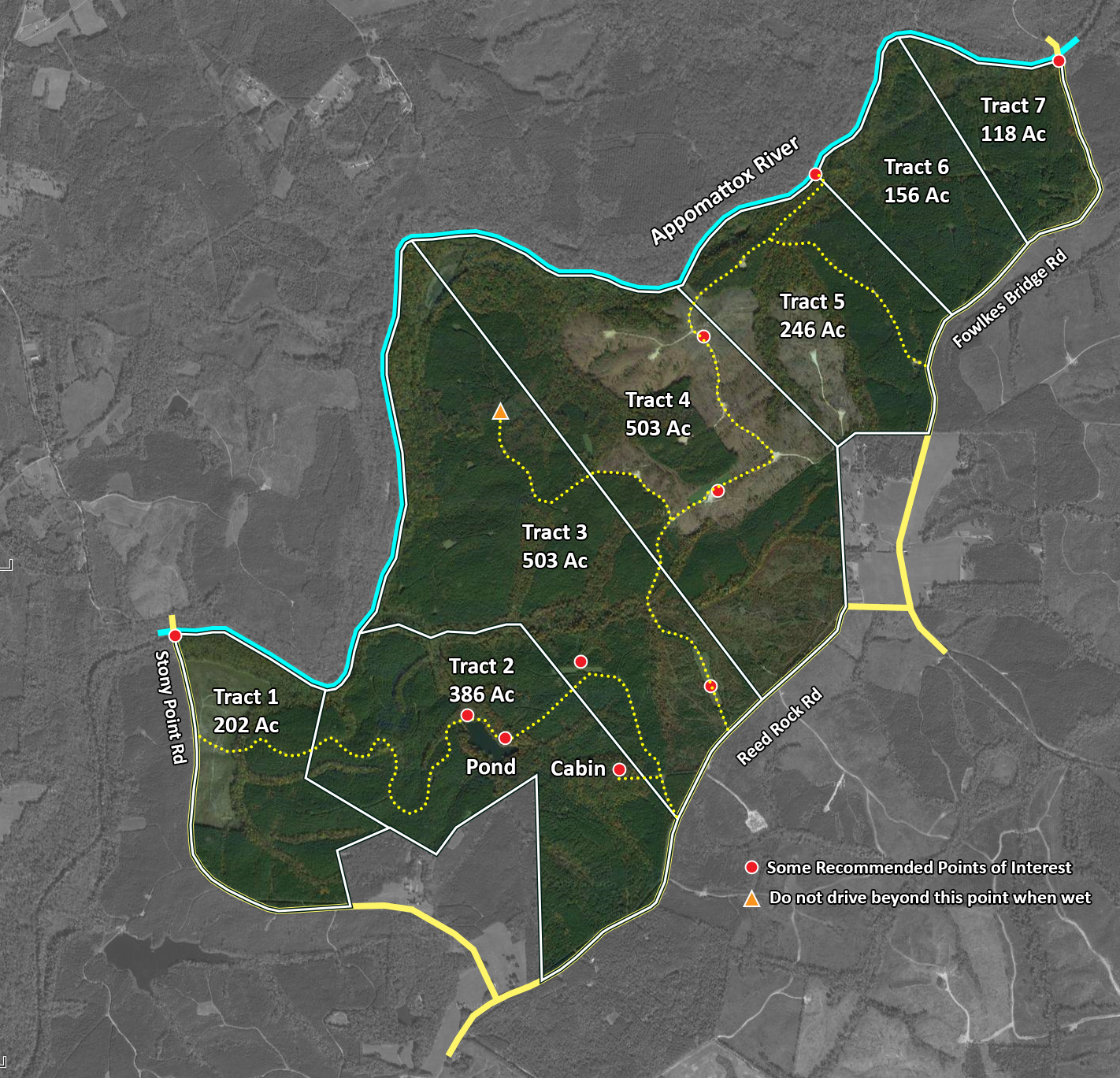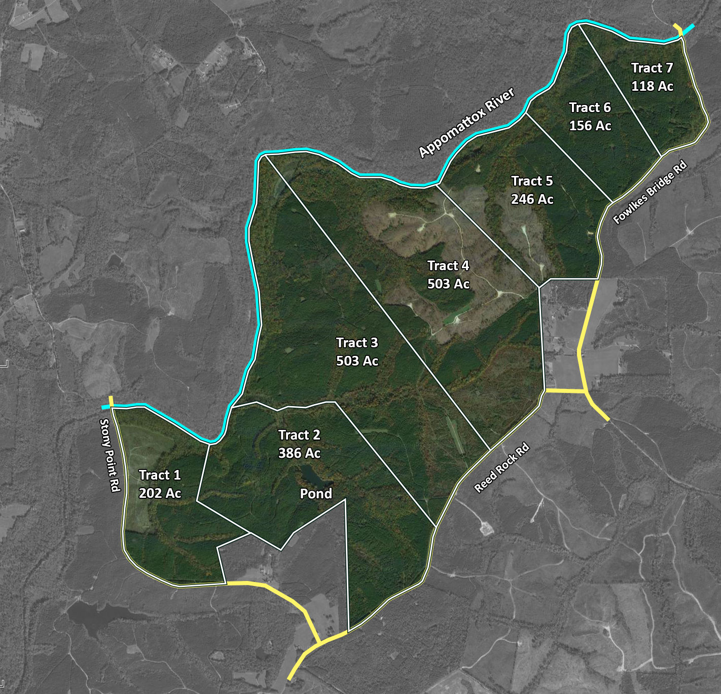 - 4.36 miles (23,067) of scenic frontage on the Appomattox River (river frontage on every tract)