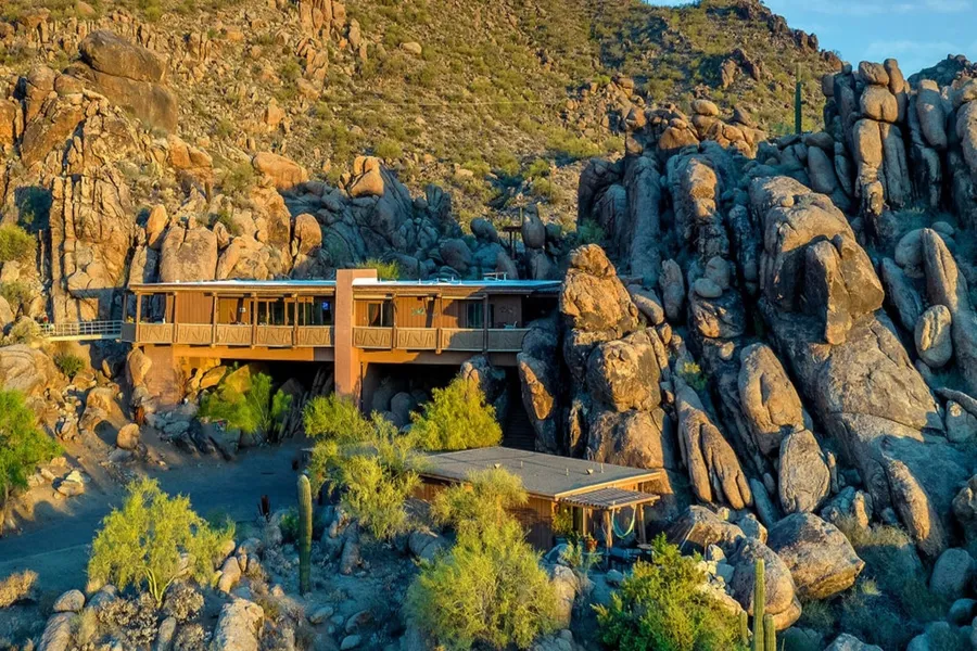 Landmark architectural wonder, first home in Arizona to bridge a dramatic canyon, built by Gerry Jones, the ''Dean of Rock Engineering'' and for 17 years, a Taliesin instructor of extreme terrain architechture. A pool that maybe the most private pool in the world. Part of the ''Golden Triangle'' neighbors to Carefree founders K.T. Palmer and Tom Darlington, who all grabbed the most astonishing homesites when Carefree was started. Called the ''Sl;ingman House'' after the orignal owners, reached by a bridge, Rock cliffs by the pool have multiple sitting areas as you go rise up the terrain. There has never been a home like this. It was a favorite rental of actor Orson Welles and film director John Huston who started filming the sequel to Citizen Kane on the property. Large casita, Owner estimates the casita sq. footage as 866, which has been added into the home square footage. Gerry Jones was quoted as saying "no one would buy the lot because architects and engineers told buyers that it was unbuildable without moving boulders at extraordinary excavation cost. I bridged the house over the boulders, the first bridge house in Arizona, moved one small boulder and saved thousands by using the boulders for bearing in lieu of a standard foundation," Jones explains. In a famous incident, Orson Wells and movie director John Huston, started filming party scenes from the sequel to Citizen Kane called"The Other Side of the Wind", but this filming violated the lease agreement and Welles was evicted. The house was a mess with antiques floating in the pool and even a car crashed into the casita. The Slingmans found Orson Welles had left a pair of his giant size 68 boxer shorts and once the home was cleaned up, each year on he anniversary of the eviction, they hoisted Orson Wells undergarmet up the flagpole and had a wine toast. This is as Classic as Carefree can be.