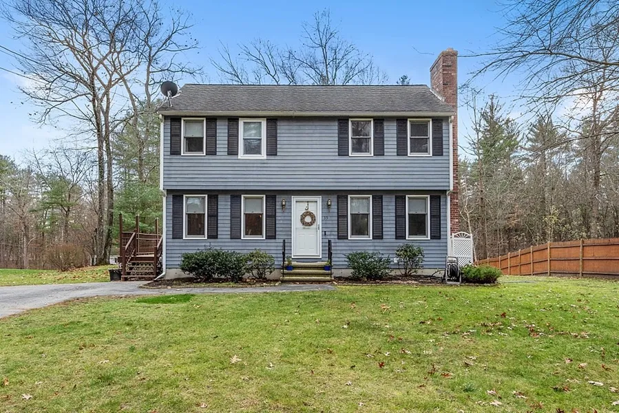 Here is a nice Garrison Colonial on a 2+ acre lot, in a private neighborhood. From the huge wrap-around deck you can enter the Kitchen which boasts Brazilian Cherry hardwood flooring, plenty of birch-wood cabinets, granite counter tops, SS appliances and a kitchen island with butcher-block top. An open concept design combines the kitchen and dining area which maintains the flooring and cabinetry motifs. Continuing past the front entrance, you'll enter the large fire-placed Living Room with a brick hearth, hardwood flooring, recessed lighting and French doors that lead to a bright Family Room featuring sky lights, ceiling fans, south-facing windows, W-W carpeting and sliders to the wrap-around deck. A convenient half-bath completes the first floor. The second floor includes 3 large bedrooms and a full bath with dual sinks, ceramic tile flooring, Corian counter tops and a Kohler bathtub and shower. With route 3's exit 88 nearby, this is a great location and a great opportunity to own.