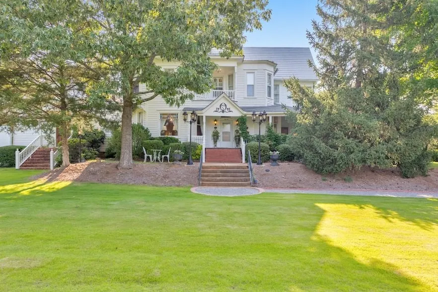 Step into timeless elegance at Founders Manor, the stunning former home of the founder of Adairsville. Built in 1840 and perched atop a private 2.2-acre hilltop lot overlooking the charming Adairsville Square, this fully restored and historically registered estate blends 19th-century grandeur with modern luxury. Sold fully furnished and rich with opportunity, this 6 bedroom / 6 full bathroom / 2 half bathroom home is ideal for a single family residence, a luxurious bed and breakfast, or a picturesque wedding and events venue. From the moment you arrive, the stately covered front porch welcomes you into the grand 2-story foyer. Inside, you ll find 11 fireplaces, soaring ceilings, and beautiful period details throughout. The formal sitting room opens to spacious family and dining rooms, perfect for hosting on any scale. The showstopping great room features beamed ceilings and flows seamlessly into the modern chef s kitchen thoughtfully added by the current owners featuring a commercial-sized stove, walk-in cooler, two dishwashers, stone countertops, a large island, walk-in pantry, and a hidden cleaning station to keep entertaining elegant and effortless. The main level includes two bedrooms with ensuite bathrooms, plus a convenient half bath for guests. Upstairs, you'll find four additional bedrooms, 4.5 bathrooms, a second smaller kitchen for added functionality, and access to multiple Juliet balconies. Make your way up to a private, detached two story deck overlooking the property and downtown Adairsville perfect for relaxing with views of the sunset over the Square. Enjoy year-round comfort with four-zone heating and cooling, and step outside to find a 100% organic garden with a white picket fence ideal for growing cut flowers and fresh vegetables. Located just off Highway 140 with quick access to I-75 and only minutes from Barnsley Resort, Founders Manor offers a one-of-a-kind opportunity to own a piece of North Georgia history with unmatched style, comfort, and potential.