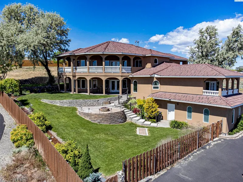 MLS# 276121 Introducing a once in a lifetime home! This luxurious Mediterranean style home boasts over 4300 sqft of breathtaking views that will leave you in awe. Step into a world of resort-style living with panoramic vistas that stretch as far as the eye can see. The lush, mature landscaping adds an extra touch of serenity to the ambiance. When you come on the property you are greeted by your own paved driveway recently sealed in 2023. This stunning unique designed home makes you feel like you stepped onto an exclusive getaway. The lush mature and professionally landscaped property all on underground sprinklers and drip lines create a unique oasis with perfect views complementing the natures canvas. Step inside the grand entrance to a modern layout with a grandeur living space which is a masterpiece of design and craftsmanship through out the home. The exquisite staircase is detailed to true architectural style. The large windows are so captivating to see all the different angles, including the meticulous yard. The remodeled kitchen that is a chef's dream, featuring a large slab granite countertop and top-of-the-line appliances including air fryer and wine cooler. The detailed backsplash, new maple cabinets with extra storage and full height luxury style added features. Every detail has been carefully considered to create a space that is both functional and stunning. The kitchen with a walk-out onto one of many large balconies perfect for enjoying afternoons in the cool shade. You will also love the updated large walk in pantry. New lighting and painting through out the entire home. The main floor boasts heated flooring in the common areas, including the living, dining, and kitchen area. There are 3 bedrooms, New HVAC in 2023, and there are four water heaters. The main floor is adorned with luxury (LVP) engineered flooring. The basement has been recently updated and finished, with a bonus room with a closet, 1/2 mans bathroom, living space with a walk out. The upper level is the primary suite with a large captivating space with views, offering ample room for relaxation and entertainment. The updates include a new toiletry room with cabinets and dual sinks, plus an extended large bath area with walk-in stone shower, soaker tub and second dual vanity area, along with a stunning walk-in closet. The stucco exterior features a garden shed, new fence, and a spacious 36 x 48 grand shop with extra features including a car lift. Own Well! Feature List available.