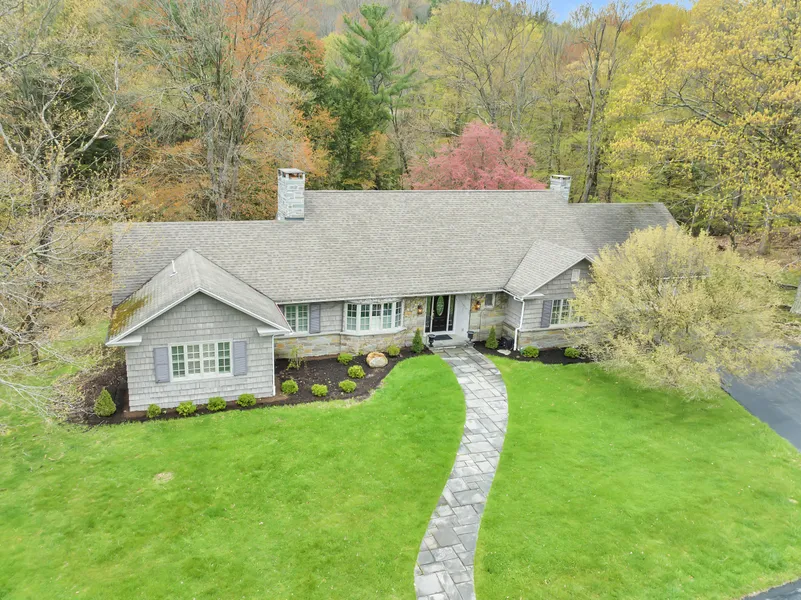 Retreat to the main level primary suite with ample walk-in closet, luxurious ensuite bath with radiant floor heating, Jacuzzi tub, and tiled steam shower. Hosting an additional 3 spacious bedrooms, one with full ensuite bath, a den, as well as gym and family room on the finished lower level, this home is set to accommodate any lifestyle. French doors open up to the enjoyable slate patio with outdoor speakers, landscaped steps leading to the bedrock stream and firepit. A true dream home tucked away, with easy access to local amenities.