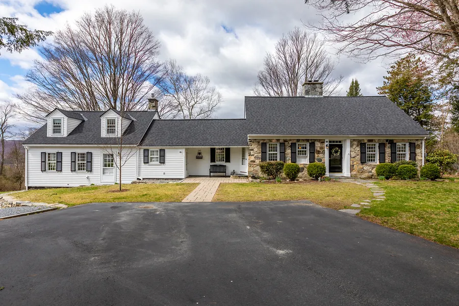 Welcome to 53 Highland Circle. This charming cape is sited on 2.2 acres and located at the end of a cul-de-sac providing a wonderful private backyard with distant mountain views. It is a quiet country setting, but only minutes from downtown. The original 1939 stone cape has an addition that was added in the 1970s. The front door opens to a generous hallway with the galley kitchen off to the left and two bedrooms off to the right, separated by a bath. Adjacent to the kitchen is a dining area with French doors open to a slate patio. The kitchen looks into a light-filled living room with a gas fireplace (which could be converted back to wood). The upstairs of the Cape has two large bedrooms and a bath. Dividing the older cape and the newer addition is a half bath, mudroom, and laundry. This area flows into a beautiful Great Room with a propane stove. Above this space are two bedrooms and an attic for storage. Below the great room is a two-car garage. The outdoor area has numerous perennial garden beds, an open yard, and a garden shed.