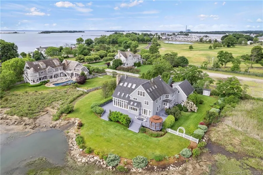 Welcome to a spectacular oasis of tranquility along the shores of East Norwalk. Located in a prestigious waterside enclave & set along the grounds of the Shorehaven Country Club, this luxurious custom residence offers a refined atmosphere where the sights and sounds of the coastal location enhance every day, allowing you to feel like you are on an endless vacation. The circular drive leads to this meticulously-maintained home, surrounded by lush professional landscaping. The front porch opens into a foyer where the dramatic ambience of this open-plan design comes into view. Vaulted ceilings, tall windows & French doors, skylights, a soaring fireplace & hardwood floors characterize the Great Room, w/a spacious layout that makes it perfect for sophisticated entertaining - all flowing out to the generous wrap-around deck w/gazebo. A peaceful office w/French doors to the porch & deck makes an ideal place to work from home. The sun-filled gourmet kitchen w/high-end appliances incl new Sub Zero, bar & walk-in pantry is beside the dining rm which also opens to the deck. An elegant living room or library has extensive custom built-ins and the 2nd fireplace. Upstairs, each bedroom is a private suite with a designer bath - and the spacious layout allows for flexible uses and privacy - including the plush primary suite which has a seating area, 3rd fpl, dual closets and more. Exquisite bonus spaces on the 3rd floor have Long Island Sound views. 3 car attached garage. Walk to beaches.