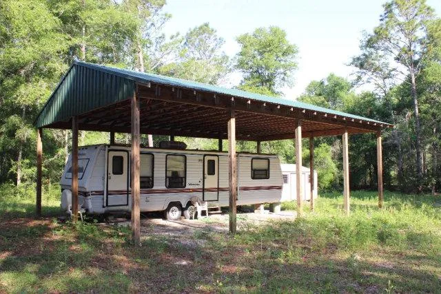 2.23 ACRES with 35ft RV near the Santa Fe and Suwannee rivers is ready for you to enjoy. Located in a country setting on the north end of Gilchrist County, this corner lot offers privacy behind the natural oak and native tree growth. The 24' x 40' pole barn protects the RV and provides a large area to entertain guests or for parking and storage. Two sheds on the property are also very used for storage. The beautiful Santa Fe River with its many springs is only mins away! Enjoy swimming, paddling, cave diving or boating on this clean river!