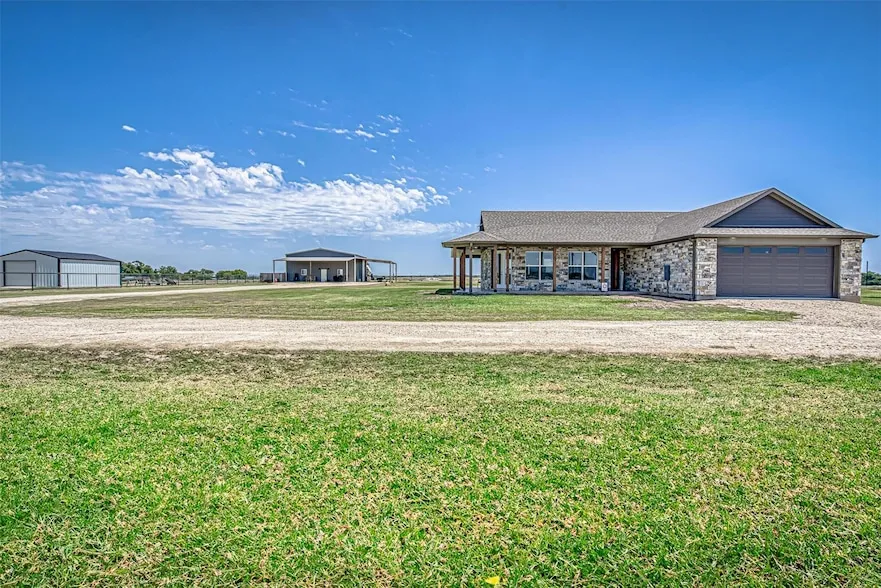 Special Financing Options Available! A versatile estate featuring a rustic and modern custom-built home, PLUS an additional 1600 sq foot outbuilding, finished out and insulated, equipped with utilities, guest bath and kitchenette. Perfect for entertaining, climate-controlled RV storage, or office space! Lush views greet you upon entrance into the private community, where this property is fully fenced with a custom entry and two structures - All backing up to hundreds of acres of serene farmland. Enjoy spectacular sunsets outdoors on the wrap-around patio with over 700 sqft of covered patio space. Inside the main home, charming details & soaring ceilings create a warm ambiance for either entertainment or for solitude on this peaceful property. The farmhouse kitchen features stainless appliances, a gas range, an island with beautiful stone details, & a convenient hidden walk-in pantry. Stained concrete flooring provides for a seamless, low maintenance finish throughout the home as you transition from the living area into the hallway. The owner's suite is privately set on the Southeast corner of the home, with large windows overlooking the back of the property. Flooded with natural light, the ensuite bathroom features a double vanity with granite counters, modern farmhouse fixtures, spacious closet with built-in features, & an extra-large, luxurious walk-in shower. In addition to the main home, the metal contributes to 3000+ total square feet on the property fully insulated & complete with AC, heat, and plumbing. Outside of the barn, three of four sides of the exterior are covered, including a large patio & RV storage with RV plug in. Located in desirable Thorndale ISD, approximately 10 mins from conveniences in Rockdale and Thorndale, & within 30-45 minutes to Temple, Round Rock, & Taylor, residences can take advantage of the serene country atmosphere while also within a quick commute to larger city amenities & growth in the Central Texas area. Low tax rate & No HOA.