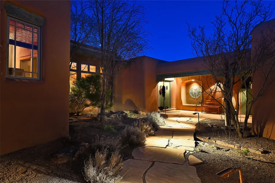 Built with loving care by award winning Tierra Concepts, this solid wall home has some of the most impressive Sangre de Cristo views in Las Campanas. Enter through a private courtyard into the art filled main hallway opening to the spacious living room. Take three steps up to the private master suite with its own sitting room or continue up a few more steps to the enclosed stairway to the roof deck. From the living room step through the dining room into the eat-in kitchen and outdoors to the expansive portal and beautifully landscaped rear courtyard. This home is perfectly designed for indoor and outdoor living and entertaining. In a separate wing of the home are two bedrooms and two baths plus a spacious studio or fourth bedroom. All of the amenities of Las Campanas are available from the Club at Las Campanas if you choose. If not, enjoy the security, the serenity and the incredible amb...