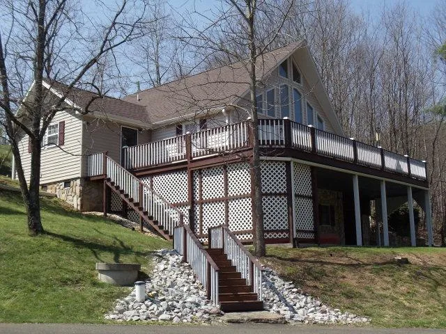 Little River Waterfront Home that is move-in ready. Sellers have done an amazing job both in & out. Park-like setting, with level open green space complete with fire pit, swings where you can fish, swim, canoe the Little River. The home boasts a wall of glass with bright, open airy floor plan. Huge open living room that flows into the dining area & kitchen up. Then you have an open great room downstairs, with a bar/entertainment area that opens out to the covered patio. Perfect for entertaining on the waterfront. Open decks overlook the Little River. Home has a full bath/tub/shower up, a full shower/lav downstairs PLUS a separate shower in the laundry suite on the main floor. Paved drive surrounds the home too. Must see to appreciate this location and home. Interior has been redone, is spotless, hardwood floors, terrific kitchen & two nice size bedrooms w/plenty of storage. The double garage & extra shed are big bonus. Come check it out. Easy to shopping, medical, Blue Ridge Pkwy too