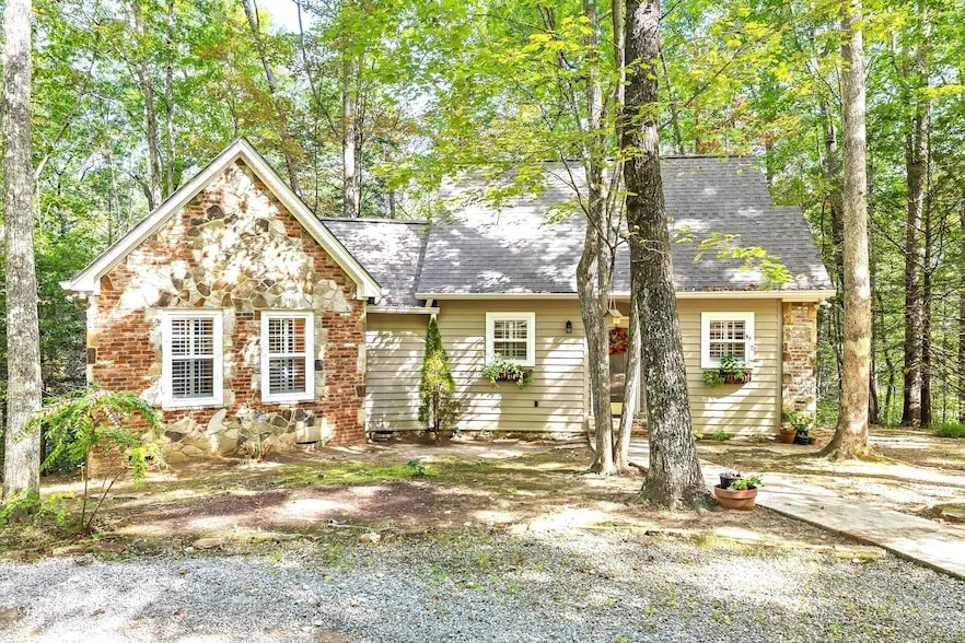 This 2.27 acre property with a cozy cottage is one of a kind and has the ''cuteness'' factor in every way! This gem is nestled in the woods, and perfect for a second home, a weekend getaway, or an Airbnb. However, the current owners have lived in this cottage full time!! Enjoy a well appointed interior with hardwood floors, high ceiling, gas log fireplace, huge deck, screened porch , and beautiful views of the woods. The large picture window frames the forest and fills the space with natural light. The double detached carport with stone accent wall pairs perfectly with the home's architecture. There is secure storage in carport with power-- perfect for a workshop or utility space. The spacious detached carport also has enclosed space/rooms for storage and work benches. If you like birding, you will enjoy the blue jays, blue birds, goldfinches, redheaded woodpeckers, doves, hummingbird...