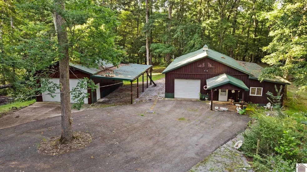 Discover this cozy cabin, tucked away on 2+ partially wooded acres, with plenty of potential to convert 1-2 more spaces into bedrooms! The acreage is comprised of 5 tracts offering the option to sell some off in the future. This charming retreat features a 3-bay carport and an oversized 2-car garage/workshop equipped with electric, ideal for storing all your lake toys. Enjoy the privacy of a secluded setting while benefiting from the (optional HOA) HOA amenities, which include access to a pool and boat ramp. Just minutes from beautiful Kentucky Lake, this property offers a fantastic opportunity for short-term rentals. Don't miss out on this hidden gem!