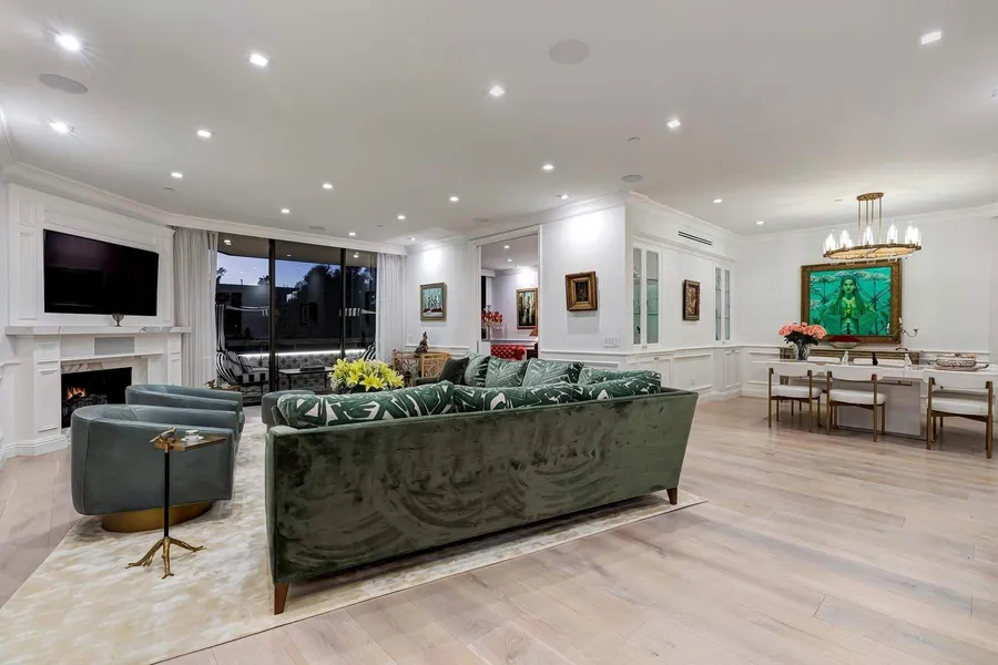 Stunning new remodeled Penthouse with 2 bedroom, 3 bath plus large Den at the coveted IV Seasons Condominiums located on a beautiful and tranquil tree-lined street in Beverly Hills. Front facing sun drenched Penthouse with city lights & tree top views. Beautiful entry with 9" wide European white oak flooring throughout, high ceilings, recessed LED lighting, custom made wainscoting & moldings and floor to ceiling windows with motorized window treatments. Terrific layout designed for entertaining featuring a large Dining & Living room with custom built ins & fireplace that leads to a custom tiled balcony. Gourmet kitchen with Italian imported high gloss cabinets, and Miele & Gaggenau appliances. The Large primary suite boasts large seating area, 2 custom walk-in closets and luxurious marble bath with a 5 star hotel feel including floor to ceiling European tiles, double sinks, skylight, fireplace, free standing tub & incredible shower. Second bedroom has custom closet and beautiful marble bath. Den/office with custom cabinetry and Viking wine fridge. High end sound system. Laundry room w/built in cabinets. 2 side by side parking with electric charger outlets. The building is known for its fabulous services including full time doormen, valet parking for residents and guests, a heated pool & spa, gym and extra storage. This building offers a great lifestyle in the heart of Beverly Hills!