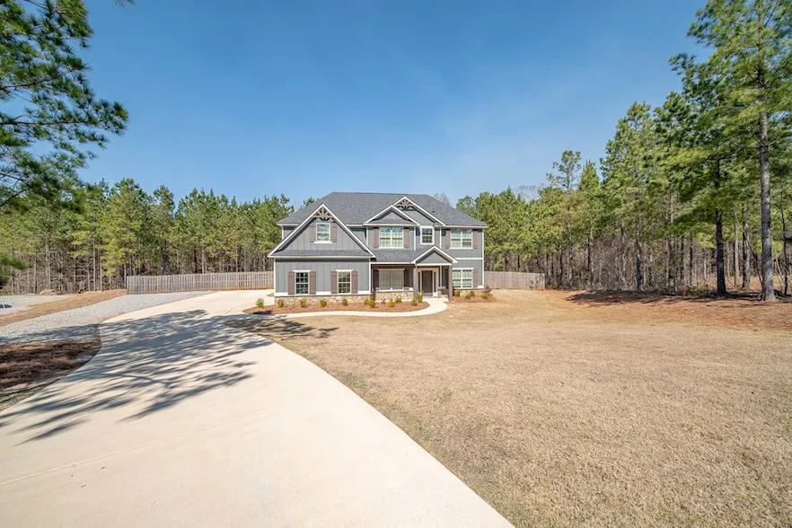 Nestled in the serene countryside of Cataula, GA, this stunning home at 264 Oak Grove Way offers the perfect blend of modern comfort and peaceful living. Built in 2022, this spacious 3,176-square-foot home sits on a generous 2.3-acre lot and features 5 bedrooms and 3 full bathrooms. The main level boasts an inviting open-concept design, highlighted by a gourmet kitchen with stainless steel appliances to include gas stove, a large island, a walk-in pantry, and seamless flow into the formal dining room with elegant coffered ceilings. The great room, also featuring coffered ceilings, offers a cozy fireplace ideal for gatherings. A guest suite, a separate office or formal living room, and a full bathroom complete the main level. Upstairs, a step-up media room provides the perfect space for entertainment. The luxurious primary suite includes a private sitting area, dual vanities, an oversiz...