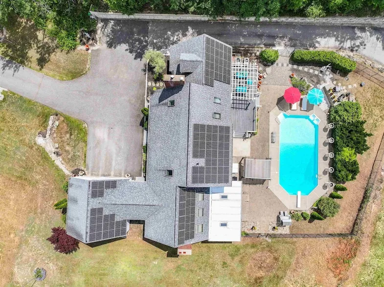 Impressive ONE of a kind Open Concept Cape w/ dormer, flexible floorplan, owned solar panels, private heated inground pool paradise, separate driveway to oversized detached garage w/ high bay door, and seasonal mountain views situated at the top of Longview Dr in an estate like setting! 1st floor w/ high ceilings boasts a grand open foyer, office, stylish powder room, huge formal dining room w/ gas fireplace, living room w/ cath ceiling w/ skylights, updated kitchen w/ granite counters, tile backsplash & floor, vintage style appliances, SS gas range & exhaust hood, pantry & breakfast nook, large family room w/ wood stove, hardwood floors, cath ceiling w/ skylights & slider to amazing sunroom, laundry room/mudroom, & fantastic 1st floor primary bedroom suite w/ 2 walk-in closets, modern updated bath w/ tile floor, vessel sinks, & warming towel rack. 2nd floor w/ fresh paint includes 2 sizable bedrooms, full bath w/ double vanity & skylights, den & 4th bedroom w/ mountain views (second primary option). Plus, full basement, high velocity central A/C, generator hook-up, large composite deck & patio each w/ a pergola overlooking fully fenced pool area, 2 car attached garage w/ new doors & 2 electric car chargers, & paved parking area w/ plenty of room for your boat or RV all on nicely landscaped 2.3 acre lot in great neighborhood w/ highly desirable Bow school system. See video, floorplan, & showing & info packet. Private showings only. Priced $100k below town assessment!