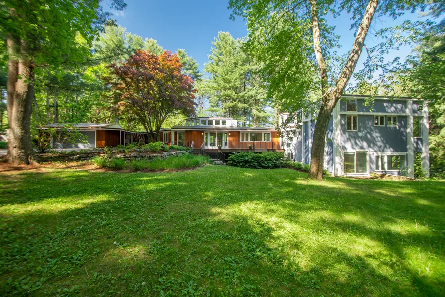 Contemporary Chic, this home originally conceived as a Mid-Century Modern home with classic open floor plan and walls of glass embracing the surrounding acreage was expanded in 1997 to offer sophistication, elegance and privacy. Three levels of living spaces present distinct wings with separate options for au pair or guest space, in home office and potential multi-generational living. Enjoy the spacious living room with granite central fireplace or wander outside from the adjacent dining room where the patio invites outdoor dining and relaxation in the serene country setting. The main bedroom is a private second story retreat with an expansive dressing area and spa like bath. Separate stairs lead to a lower level with a stunning three-story corner wall of windows framing a large media room and leading to a wing of bedrooms or offices and an exercise area. All ideally located on a peaceful country road with easy access to town, commuting routes and Lincoln's expansive network of trails.