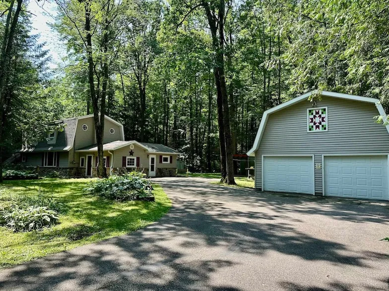 Located across from the river you will find this gem nestled on over 2 wooded acres. Peace and tranquility abound, this property is located near the end of the road with minimal traffic. There is a large laundry/mud/utility room, a family room with free standing wood fireplace, open concept kitchen and living room. Main floor bath and bedroom. Office area as you approach the stairs going up. There is one more large bedroom upstairs along with a free-standing gas fireplace. The window treatments and curio cabinet in the living room are also included. Please allow the seller at least 24 hours to respond to offers.