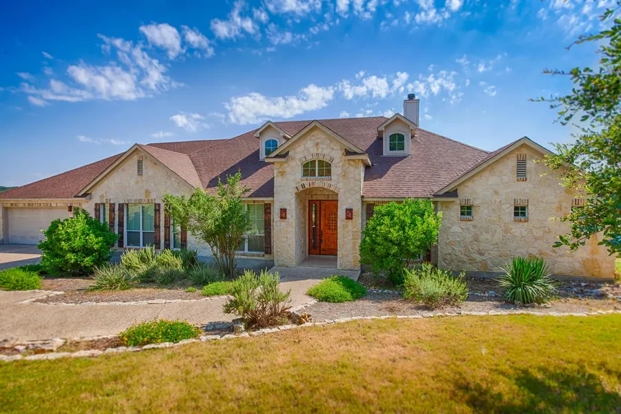 Stylish transitional WATERFRONT home on the Guadalupe! 1 Story w/Keith Zars Pool features Slate Floors, Black Granite Counters, Stainless Steel Appliances in a fantastic Entertainer's Kitchen;Split Floorplan w/spacious room sizes; Perfect for Year Round or Weekender Living; Luxe Master Suite w/Black Granite Counters & SS Sinks & awesome shower & tub; Guest Suite offers handicap accessible bath; Study w/Closet & Full Bath;LARGE tandem 6 Car Garage is heated/cooled w/outside access;Multiple Decks overlooking Pool & Pasture
