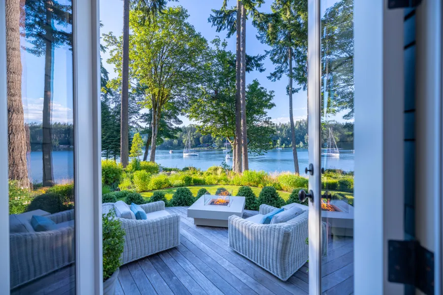 10512 + 10536 on coveted Country Club Rd, an exquisite estate w/ a 4 bd/5 bth Hamptons-style home including extra 768 sqft bonus space above garage & separate buildable lot, with seller financing available for vacant lot! 2.34 acres w/ 297 ft of waterfront, these private grounds boast beautifully landscaped gardens, impressive Seattle views, forested creek & easy low bank access to Blakely Harbor. Featuring luxury designer details throughout. Large gourmet kitchen w/ Sub Zero/Viking appliances, calacatta marble countertops & stunning marble/glass backsplashes. Main floor primary ensuite opening to deck w/ sweeping harbor views. Custom rock fire pit, large wraparound ipe deck, expansive patio spaces, 2 buoys & additional outbuildings.
