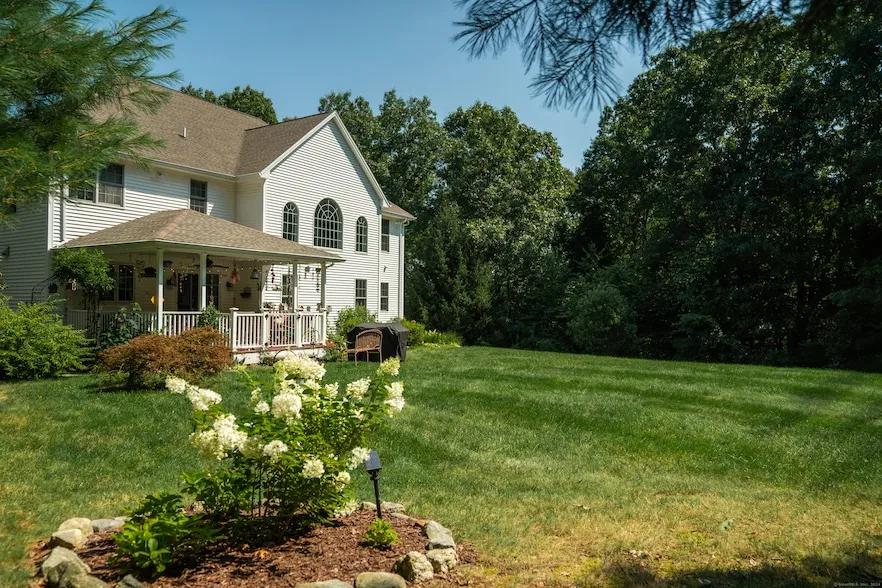 What a marvelous house situated in the northern reaches of one of CT's most quaint towns. This stylish contemporary colonial has so much appeal! As you approach the house, you are greeted with its private setting, wonderful landscaping and variety flowers that will bloom throughout the seasons. There is an entryway porch as well as a covered rear porch, great for entertaining or launching the afternoons away. The two story entry foyer is so inviting. To the right is a generous formal dining room with trey ceiling, easily seats 8. To the left is an office. Nice privacy in this space for those who work from home! As you move through the hallway; you come to a majestic open family room. Two stories high, with arched (palladium) windows, fireplace and hardwood floors. This room is open to the elegant / warm traditional Kitchen. GE profile appliances, center island, abundant cabinetry and a pantry for extra storage. There is access to the three car attached garage. Great, when bringing in the groceries! Also, a slider that leads to the rear covered porch. Completing the main floor is a half bath and a den / computer/ library rm to the rear. The basement is unfinished, but a great storage area, high ceilings and awaits the new owners potential dreams. When we go upstairs , you get a view of the two story foyer and the impressive overhead view of the family room. There are 3 generous sized bedrooms and a primary bedroom with an ensuite