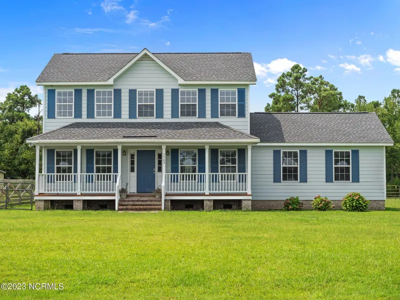 Welcome to your 4 bed/ 3 bath farmhouse nestled on 2.34 acres in coastal North Carolina! This exceptional property provides a haven for both horse enthusiasts and those seeking a tranquil country retreat. Step onto the inviting rocking chair front porch and through the foyer where the spacious living room awaits, complete with built-in shelving and LVP flooring. The heart of this home is a large eat-in kitchen equipped with stainless steel appliances, including a NEW dishwasher and stove, shiplap finishes, solid surface countertops, and white cabinetry. Windows overlooking the backyard flood the space with natural light, providing the perfect spot to enjoy your morning coffee! The main floor also features a spacious guest suite with an ensuite bath and walk-in closet. Upstairs, the sprawling primary suite features an updated ensuite bath with a walk-in shower, a garden tub with a stateme...