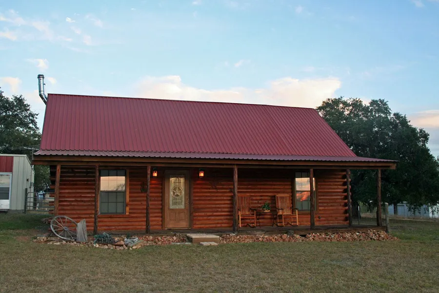 REDUCED!!! Very cute approx. 1000 sq. ft. Satterwhite log home, built in 2006 on just under 3 ac in rural subdivision just west of Llano. The property is fenced/cross-fenced for yard &/or pasture areas. This home is being offered with most of the furnishings, is as cute as a bug, clean & move-in ready. There is a spacious open-concept living/kitchen/dining area downstairs, bedroom w/big closet, nice size bathroom w/separate utility area for washer & dryer, walk-in pantry under the stairs, custom mesquite and wrought-iron banister, spacious loft upstairs w/closet and large lighted under-eave storage areas, water softener, window units for A/C and woodburning stove for heat in living area, if needed. Living, dining, kitchen and master bedroom also have decorative ceiling fans. Plugs in the loft storage areas in case someone wants to put in central heat and air. Its thick log walls and metal roof maintain a generally comfortable temperature. It is extremely low maintenance with tile and/or wood flooring thoughout. There is a large covered front porch, & tiled, screened in back porch. Relax under the shade of some huge live oak trees around the house. The garage also has a functioning sink & shower, & a toilet that could be hooked up to the existing septic for a complete extra bathroom; this area, partitioned from the primary garage, could be finished out for extra room. There is a covered area outside the garage as well as a concrete slab on the side for the vehicles or storage. In addition, There is a pole/hay barn with electricity and water in the shaded side yard which can be used as another shop area or would servce as an ideal location for a horse barn and pasture.