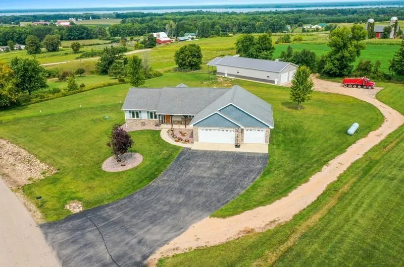 Experience a million dollar view of Shawano Lake from the expanded deck of this quality constructed home. Open concept cathedral ceilings with fireplace in the living room that leads to the large deck. Knotty Pine cabinets, an island and walk in pantry in the kitchen. 3 spacious bedrooms including a primary suite with walk in closet and full bath. Full walkout lower level with access to the large patio and firepit. 1st floor laundry, 3 stall heated garage, with running water 40x90 pole building with a 20x 38 finished area with 2 horse stalls and water. All situated on a nicely landscaped 2.5 acre lot. Home has been pre-inspected. Seller also offering Home Warranty.