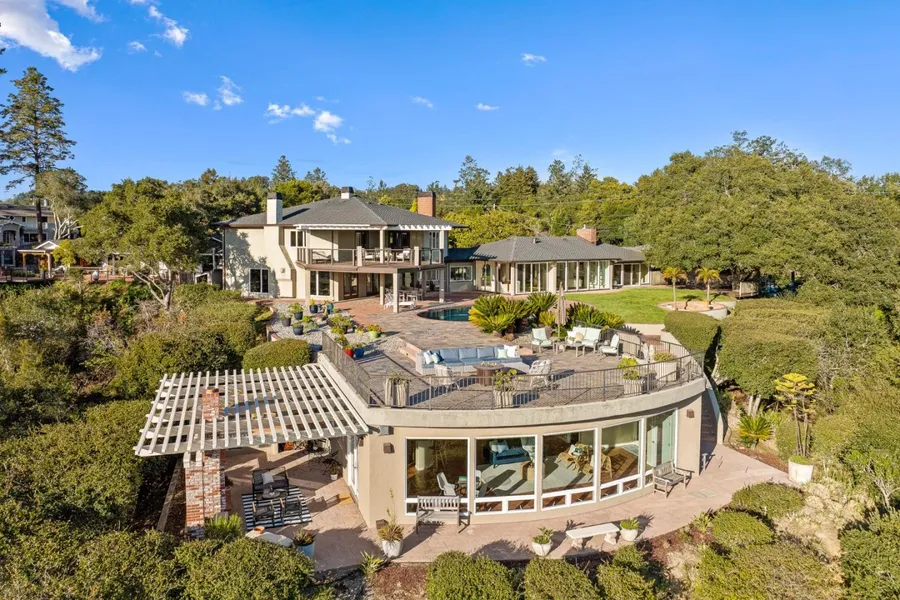 Behind the gates of this private estate, you will enjoy an entertainers dream home, matched with unparalleled views of the city, the ocean, and Pogonips rolling hills. As you walk through the front door you are immediately immersed in beauty; warm hardwood floors, expansive living and dining areas, and a striking wall of windows brings the spectacular views right to you. The sprawling first floor features two spacious bedrooms, two bathrooms, and a chefs kitchen with commercial-style range and a built-in breakfast nook overlooking the pool and the Monterey Bay. The second living room features another fireplace, and elegant wooden cabinetry frames the dream bar and adjoining wine room. Upstairs, the primary suite is a true retreat, boasting a generous bedroom, a spa-like bathroom, two walk-in closets, a private library with fireplace, and a private deck with views across the bay to Monterey. Below the main deck you will find the private pool house featuring a Tuscan-style dining patio, fireplace, built-in BBQ, and a pizza oven, all with breathtaking views. This estate blends luxury, privacy, and entertainment in a convenient location close to Santa Cruz and the highway.
