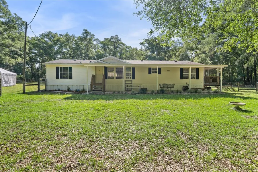Welcome home to this quiet retreat! Nestled at the end of a tranquil country road in Archer Florida, you’ll find this charming 3 bed 2 bath mobile home. Enjoy privacy and convenience! Situated on 2.45 fenced acres with wooded surroundings, but a short 15 minute drive to Gainesville and all of the amenities on Archer Road. This home features 3 large bedrooms with ample closet space, open-plan living room/ dining room, and indoor laundry. The large owner’s suite has a private bath with jetted tub, separate shower and double sinks. In the large eat-in kitchen you’ll find plenty of cabinet space, a built-in desk, and pantry. Outside is a large covered front porch, screened in back porch and a metal cover for both of your vehicles. There are 2 sheds on the property with space for all of your lawn equipment and extra storage. The landscaped front yard has additional fencing perfect for your pets, and the backyard offers plenty of space to plant gardens, add a pool and so much more. A newer roof and HVAC replacement in 2023 offer peace of mind. Schedule an appointment to see this cozy country home today!