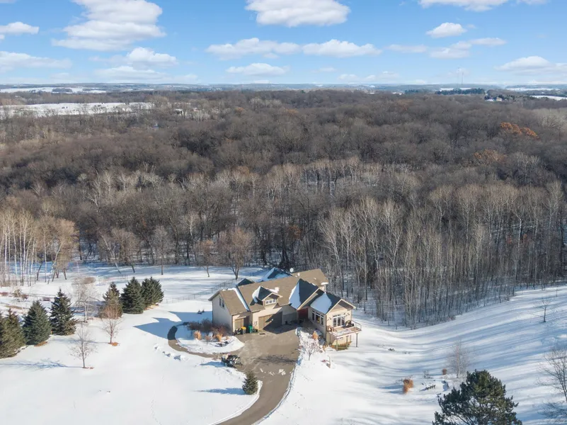 This home has everything you've been looking for! Custom built one story home with a bonus area/in-law suite above the garage, plus 6 garage stalls- 3 are visible, 3 are under spancrete under the main garage. The home's exterior features high end Hardie board siding, top of the line windows, custom real wood double front door, and a wrap around deck all on 2.5 private acres with no neighbors behind. Enter on the main level and you'll find an 18x15 gourmet kitchen complete with knotty alder cabinetry, granite counters, a huge center island and high end appliances. The rest of the main level contains the primary bedroom and bath, laundry, another bedroom, two more bathrooms, and the living room with windows on three walls along with a two-sided fireplace. Take the stairs up to the bonus area and you'll find a versatile space fit for live-in family, guests, kids, or just a fun area to enjoy. The walkout lower level has heated epoxy floors, another fireplace, plus 2 beds and 2 baths.