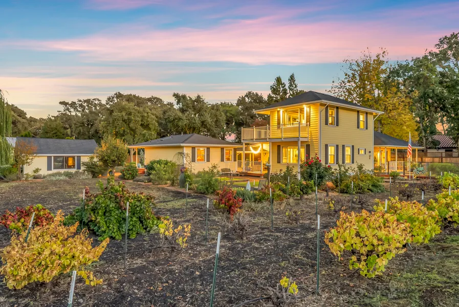 This country compound situated on 2.46+/- acres offers peaceful views, space for extended family, and outbuildings suited to a variety of outdoor hobbies. The 2,806+/- sf main home has been tastefully remodeled and expanded to include all the conveniences for today's modern lifestyle. Totaling 3 bedrooms, 3 baths, the house offers an ensuite main bedroom plus a second story bonus room with a balcony. The gourmet kitchen features new cabinetry, granite countertops, stainless-steel appliances, eat-in island with an open concept dining area, and an extensive butler's pantry. A charming detached bedroom suite with a luxurious jetted tub and its own mudroom is connected to the main house by a covered breezeway. An enchanting courtyard offers privacy and comfort, and blends the indoor and outdoor spaces. In addition to the living areas, the property boasts a large 1,200+/- sf barn which could be used for anything from a workshop to covered entertainment area. Two additional crib barns provide historic charm, surrounded by open space for vineyards or animals. The RV cabin is fully outfitted for guest overflow. New well. Not in the Sonoma County X zone.