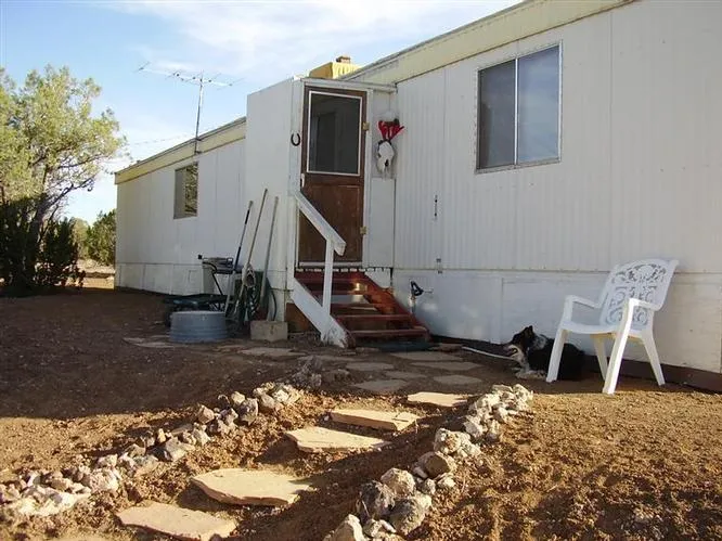 Sitting on almost 2.5 acres is this affordable 2 bedroom 1 bath manufactured home. It is currently surrounded by undeveloped land on all sides and affords quiet serenity and appealing panoramic views of the surrounding countryside. The kitchen is freshly painted and most furniture is included. The almost 2 acres to the immediate north can be purchased for an aditional $1000.00 giving the new owner almost 5 acres! There is a seperate building in the shape of a native american hogan which served as the owner/artist's studio. Will be vacant in mid June.