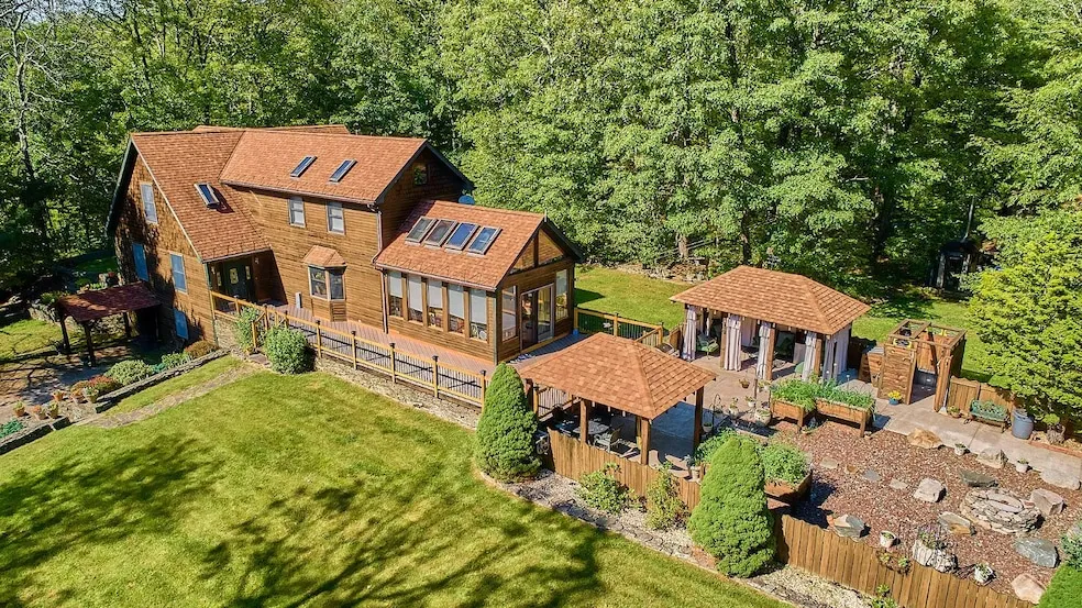 Welcome to your country sanctuary! This one of a kind home boasts an open kitchen, propane cook top, double wall ovens, a large island & plenty of cabinetry, a sunroom/dining area w/ high ceilings, walls of windows, skylights, & radiant heat to give you a feeling of being outdoors, step down to your cozy living room, 2 bedrooms, a full bath all on the main level. Upstairs is your own private space. French doors lead to the primary bedroom w/ vaulted ceilings, an office, hot tub room & a primary bath with a bidet & shower stall. The lower level features a tiled foyer, family room, den, exercise room & a laundry area. Whether you like to curl up with a good book or entertain, the fenced yard has the space for you, 2 cabanas, an outdoor shower, rock garden w/ a stone sitting area, raised bed garden, lovely decking & a beautiful lawn w/ stone walls, walkways, steps built by the owner. Plus a...