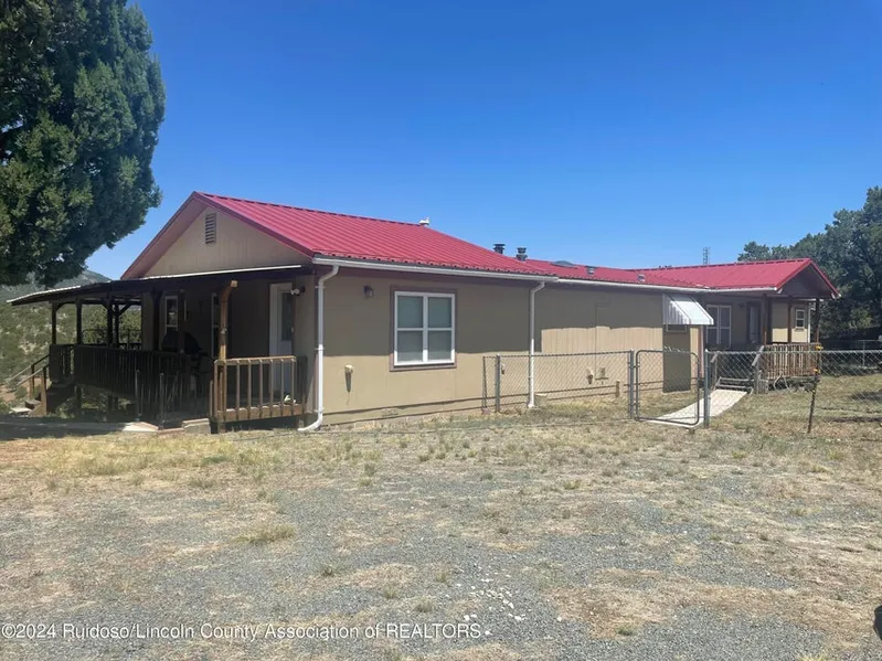 Quiet and tranquil location in the Nogal area with a spectacular view of the mountains. This Solitaire MH sits at the top of the hill with a very large covered deck for relaxing and enjoying the outdoors. Well constructed 18'x28'add-on could be used for an office/bedroom/game room. Interior features 2''x6'' studs, sheet rock/textured walls, plywood floor decking, metal roof with gutters. Detached four car garage with 8ft bay doors, openers, work benches. Water softener. Two storage sheds. Chain link fenced yard. Watering system for fruit trees. RV pad. Abundant wildlife.