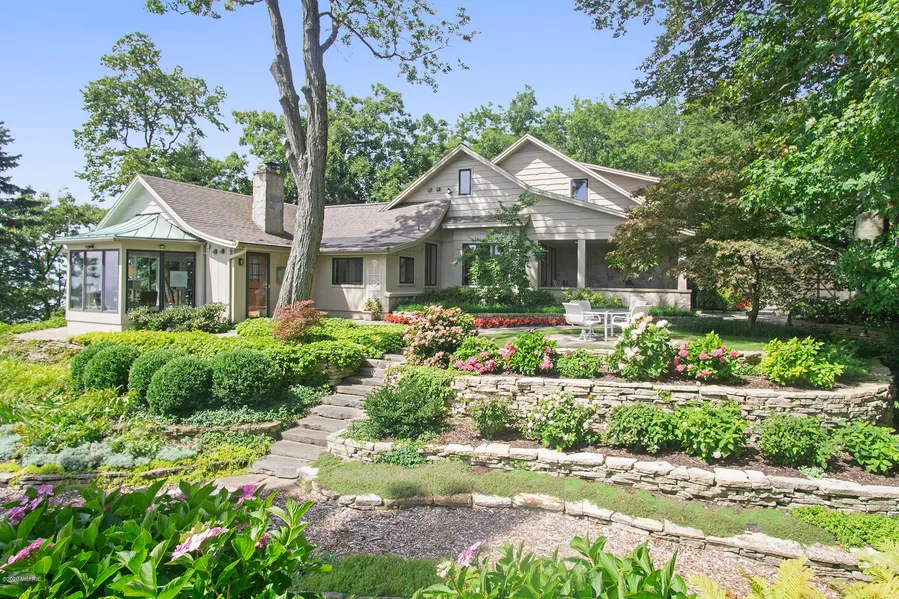 200 feet of beautiful Lake Michigan beach just south of the Saugatuck Dunes Park with 2.5+ acres and a 4 bedroom, 4.5 bath quality home with updated baths, a theater room, a huge lakeside deck, and GREAT views of the lake & sunsets. The main floor has 10 foot & taller ceilings and is very charming with lots of wood. 3 fireplaces, hardwood floors, Pella windows & doors, a workshop, a hydro jet shower, an entry from garage to lower level, a newer generator, instant hot water, 3 HVAC systems. 2019 exterior was painted. Beautiful landscaping. 3-stall attached garage and nice privacy. On a private drive located between Holland & Saugatuck. Very private park like setting provides a year round relaxing atmosphere. Spacious landmark home with a unique warmth and charm.3 fireplaces that can still burn wood. Lower level has a gas feed. 2,000 sq feet of decking and about a 2,000 sq foot garage. Fiber internet at the home. Living room has great bookshelves with beams and wood ceiling and stone fireplace with gas insert (can burn wood). Beautiful gardens and landscaping. Never had need for seawall and beach stairs and decking and vegetation all intact. House sits comfortably back from the waterse dge but enjoys great views and a huge deck. 2,000 gallon LP tanks (2, underground). Great water. Snow-melt system under the fieldstone patio in back/road side. Older cottage attached to newer home. 200 frontage on the lake with great beach.Upstairs are 2 bedrooms, 1 bath and a middle office/loft area.Main floor has living room/great room, kitchen, dining room, master suite, 1/2 bath by back entry/mudroom, laundry, a 2nd kitchen in the guest house, bedroom, living, and bath. The cottage has been winterized with newer windows and doors. Pella windows & doors. Newer 3 double sliders in Living Room of main home. Security system but not using currently. Lower level has a theater room with brick wall and fireplace, workshop, exercise/family room with mini refrigerator, bath, storage and mechanical areas. Upper balcony.