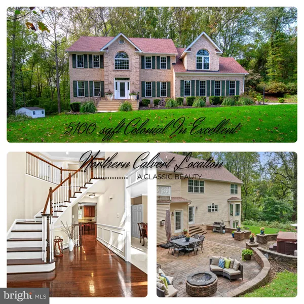 A Northern Calvert 5100sqft beauty nestled on a private wooded 2.5acre lot off of a quiet cul de sac in the highly-desirable community of Dunleigh. This immaculate home offers 4 bedrooms, 3.5 baths, a chef's kitchen, an entertainer's dream fully-finished basement, and a resort-like primary suite, this stately property will surely impress. Gorgeous hardwood floors on the main and lower levels, custom trim throughout and 9-foot ceilings. Enter the two-story foyer and admire the curved staircase. The main level offers a family room with fireplace, living room, dining room, kitchen, laundry and half bath. Upper levels offers the primary suite complete with a newly renovated (2023) ensuite bath, two walk-in closets, vaulted ceiling, sitting room and a balcony to enjoy your morning coffee. There are three additional spacious bedrooms and a full bath to round out the upper level. Enter the lower level through a gorgeous stair case in the foyer and be stunned with the attention to detail in the fully finished, walk-out basement perfect for entertaining. Custom bar, gaming area, fitness room, full bathroom, and second family room. Continue the entertaining outside on the two-tier hardscaped stone patios, complete with boulder stairs, a hot tub, firepit, lounge area, and dining area. The yard offers plenty of room for a future in-ground pool, activities, gardening or any other outdoor activity you desire and a shed to keep all of those toys or equipment. A two car garage with workshop is an added bonus. New energy efficient windows, doors and new 30yr architecturally shingled roof (2019). This home truly offers the best of both worlds: a tranquil country atmosphere with the convenience of nearby amenities. Northern Calvert County offers easy access to Andrews AF base, Washington DC and Northern VA. Make 2815 Dunleigh your new home today!