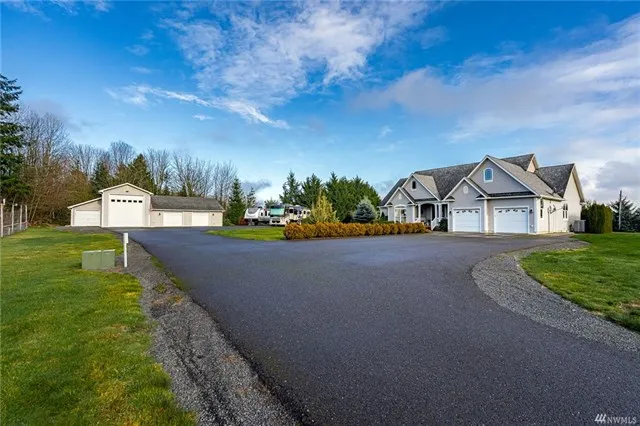 Quality throughout in this custom-built home. Cathedral ceiling in large great room with propane FP, built-in cabinetry, and mountain view in the distance. Kitchen features stainless steel appliances with double ovens, solid countertops, and lots of storage. Sunroom off great room that also opens to master bedroom. 3 bedrooms, plus office, dining area, and a bonus room above garage. Outbuilding matches home, heated & insulated shop area with bath, 16 x 40 insulated RV garage, and 2 additional RV parking spaces with 30-amp power, water, and septic to each. All this on 2.5 acres with paved driveway and only 5 minutes to 1-5; midway between Seattle and Portland. Come look today, this type of property cannot be duplicated at this price.