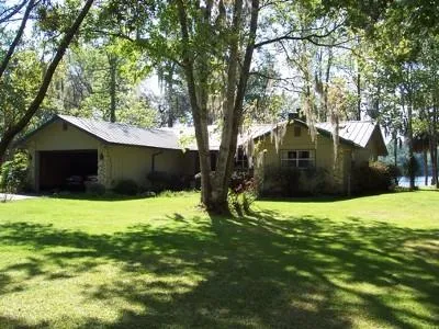St. Johns Riverfront Estate on deep water with 2.5 +/- wooded acres, 106' +/- of riverfront, 4-car garage, carport, RV storage, living/dining room combo with large stone fireplace, decks off bedrooms, screened deck, BBQ deck at river, dock, boathouse with lift, bulkhead, stocked fish pond, sprinkler system & garden tub.