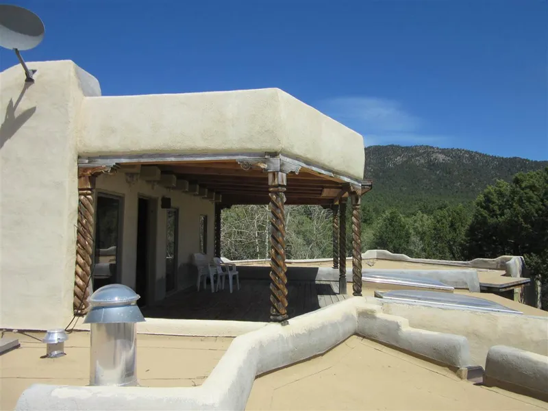An three bedroom adobe in the woods, private, views. Fireplace. Second story sun deck.