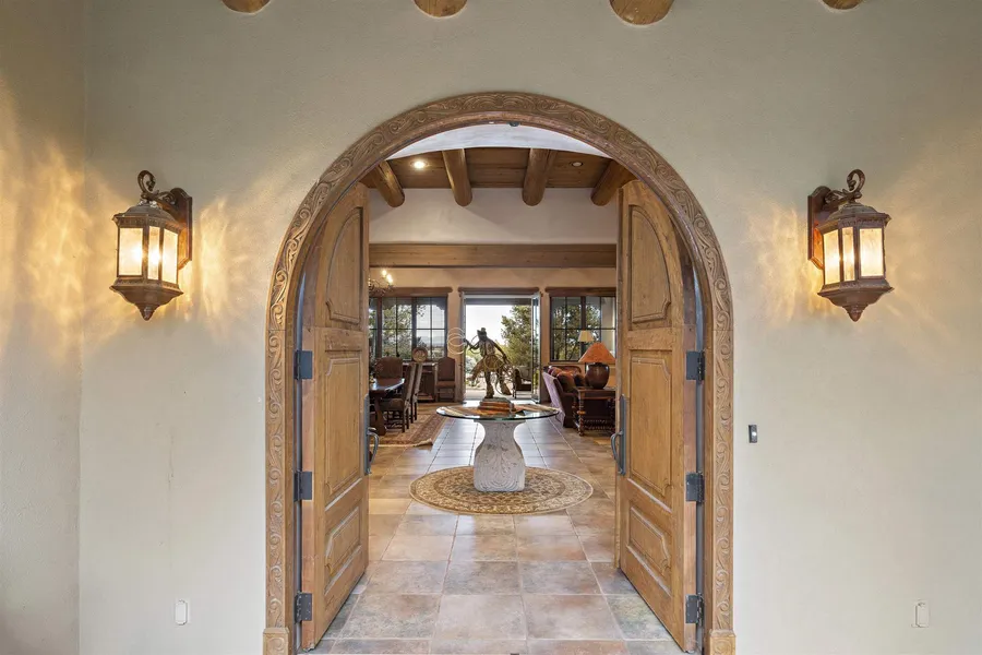 A grand and luxurious property in the coveted Las Campanas Ranch Estates neighborhood, this majestic, single-level residence consists of an elegant 4-bedroom main house and a 1-bedroom attached guest casita. The custom-built propertys main residence is just under 6,000 SF with each thoughtfully designed living area oriented to access the wrap-around outdoor portal and accompanying western mountain and sunset views. A wonderful roof deck with 360 views completes the feeling of expansiveness and connection to New Mexicos incredible landscape. Six fireplaces, including a kiva in the outdoor patio, provide intimate points of contact amid the grand scale. Massive beamed and viga ceilings soar over classic and timeless finishes including thick plastered walls, wooden lintels, columns, carved mantels and doors, and multiple built-in display shelves. In sync with the rest of the home, the kitchen conveys an elegant livability. It is fully appointed with double ovens, warming drawer, a 6-burner stove, and a large center island for food prep that doubles as counter seating for casual eating. For larger meals and gatherings, the kitchen flows seamlessly to another dining area and sitting room and then to the formal dining and entertainment areas. This home also includes a handsome office with built-in cabinetry and storage closets. The attached 1,600 SF 1-bedroom casita includes its own kitchen, dining room, living room and full bath. A separate entrance allows for complete privacy.