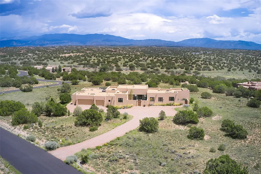 This elegant and sophisticated architecturally designed home was built for the one and only owners. The floor to ceiling glass doors and windows take advantage of the unparalleled Sangre De Cristo mountain views. Enjoy sunrise coffee or moonrise entertaining from the vast patios and gardens. The exquisite details include extensive art walls and carefully created shelving to showcase your artifacts or library. State of the art lighting enhances your days and illuminates your nights. A home without a single step features a sumptuous master suite with one of the most commodious walk-in closets in Santa Fe. In the same wing are two private offices, one with an adjacent studio, the other with a private patio. A guest suite with a full bath is in another wing of the home and two more guest rooms are remote and completely private. An oversized three car garage is accessed from an impressive lau...