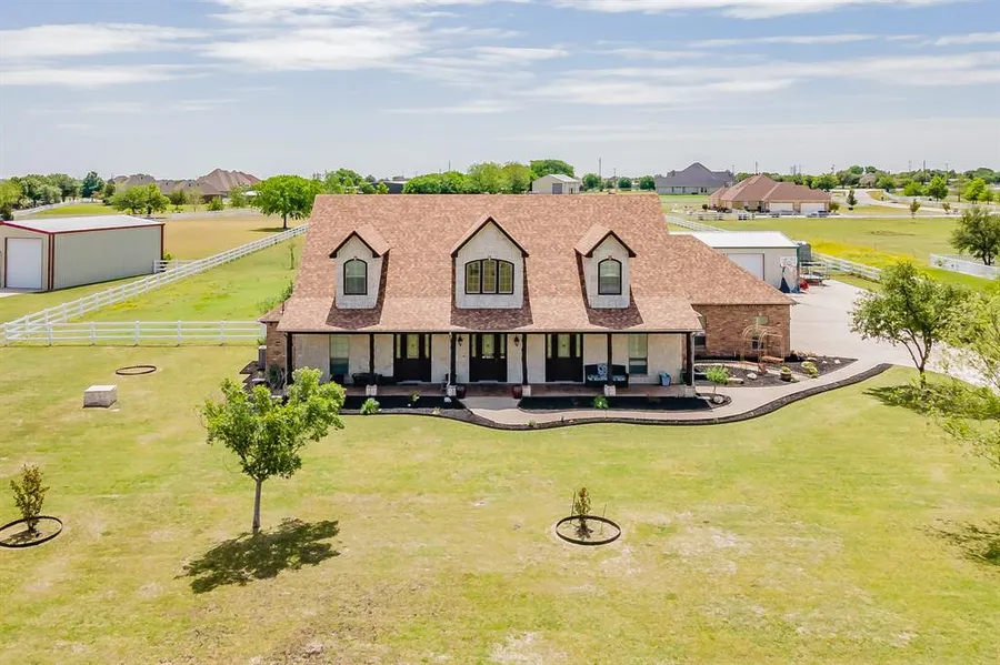 Welcome home to this Texas style custom home nestled on 2.5 acres featuring a backyard oasis w a pool & spa & a 3 car garage. This rare beauty boasts upgrades galore starting w the oversized porch & soaring ceilings greeting you at the door. Floor plan is inviting w a spacious living room, office, huge kitchen, dining room, breakfast nook, media room & game room w a wet bar. Kitchen features granite counter tops, island, breakfast bar, custom cabinets, gas range, walk in pantry, & a built in desk. You will love all the upgrades throughout - hardwood tile, hardwoods, plantation shutters, crown molding, wrought iron staircase, stone fireplace, built in cabinets in the office, tornado closet, & a huge back porch! Look no further for that dream property equipped with a insulated 30x50 workshop with 3 doors, 2 rooms inside, a half bath & a work sink, 3 horse stalls w turnouts, & a tack room. ...