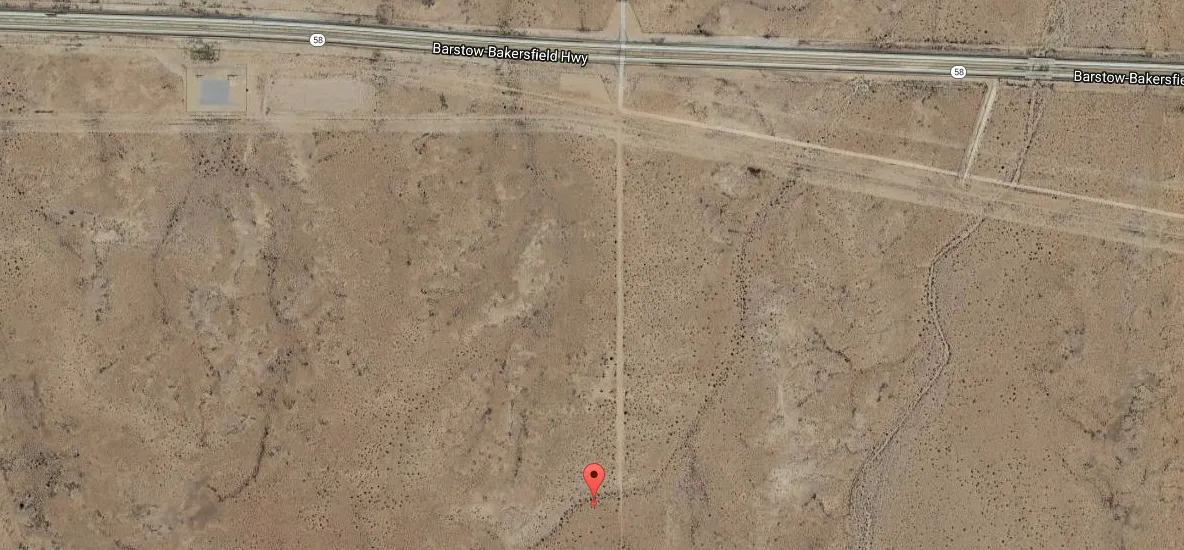 This parcel is just 0.5 miles south of Highway 58, with a paved highway turnoff and a connecting dirt road visible in satellite imagery. The parcel is 1.8 miles east of Helendale Road, which is the main access road into Helendale from Highway 58.