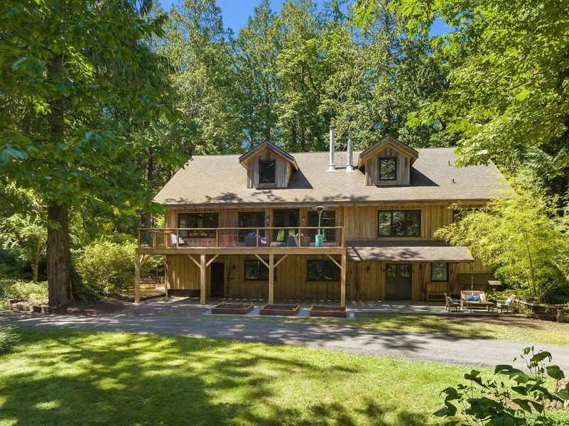 Builder's own custom home seamlessly melds Northwest lodge-style exterior (built from timber harvested on site) with an open floor plan interior of finely detailed Craftsman features, including; oak flooring, trim and accent detail, Wolf and Sub-Zero appliances, plus stained glass, antique interior doors, and hardware to nicely finish things off. The main floor offers a spacious kitchen with eating space that opens to the living and dining rooms and also features the primary bedroom, an office, and an additional 2 bedrooms. Upstairs includes a second office, family room, and a 4th bedroom (perfect for guests!). The property also includes a large workshop, dark room, and outbuilding with power and internet, plus deeded beach access to the nearby community beach!