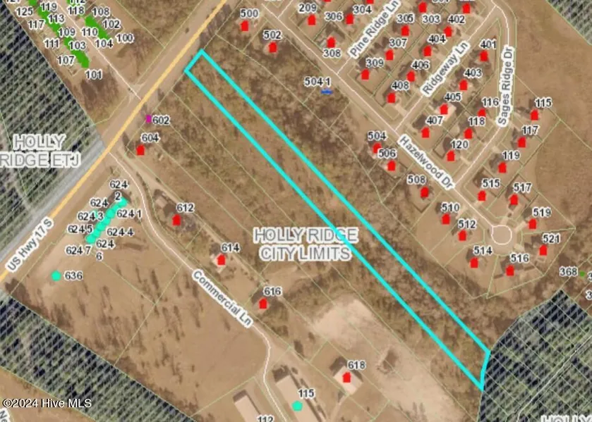 Two, 2.5 acre tracts, side by side zoned commercial that are available to be purchased together as a package deal for a total of 5 acres with over 150 ft of road frontage on Hwy 17 in the heart of Holly Ridge. See adjoining parcel listing. Buyer to verify School district and zoning with Holly Ridge.