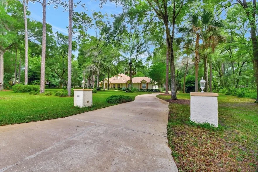 Discover this exquisite custom-crafted home with over 3800 sq. ft of living space on a 2.5 beautifully wooded acres within the highly desirable GATED community of Glenwood Oaks. This home offers an exceptional blend of privacy, comfort, and tranquility complemented by modern conveniences such as UNDERGROUND UTILITIES. Featuring 4 BEDROOMS with 4 FULL BATHS and an additional 1/2 Bath. Note the 10 foot ceilings and beautifully crafted crown molding in owner's suite and great room, along with tray ceiling in dining and in the owner's suite area which adds a touch of elegance. Ideal for entertaining, the home includes a formal dining room, a separate living room, and a great room with wood burning fireplace and French doors that open into a large Florida room bathed in beautiful natural light. The main areas of the home have imported 18" Terracotta tiles which provides a warm and inviting am...