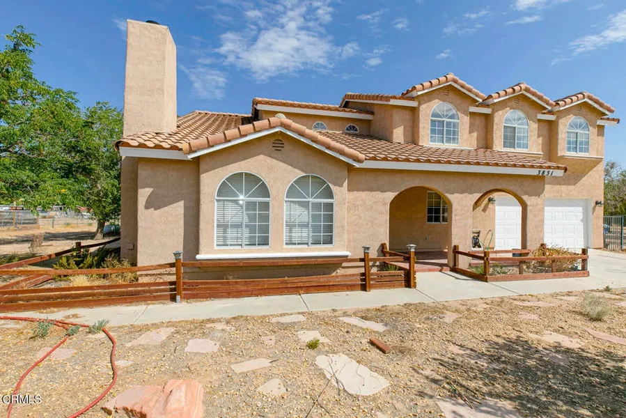 Spacious Spanish style 2100 sq. ft. custom home has front gate entry, cross fenced with pipe corrals a lot of smart home features. Fantastic 2.52 acres Palmdale Hills Mini Ranch W/horse facilities. The kitchen has white cabinets and granite tile counter, stainless dishwasher. The Common Room has a beautiful view of the back yard. Its close to schools, shopping and the 14 freeway.