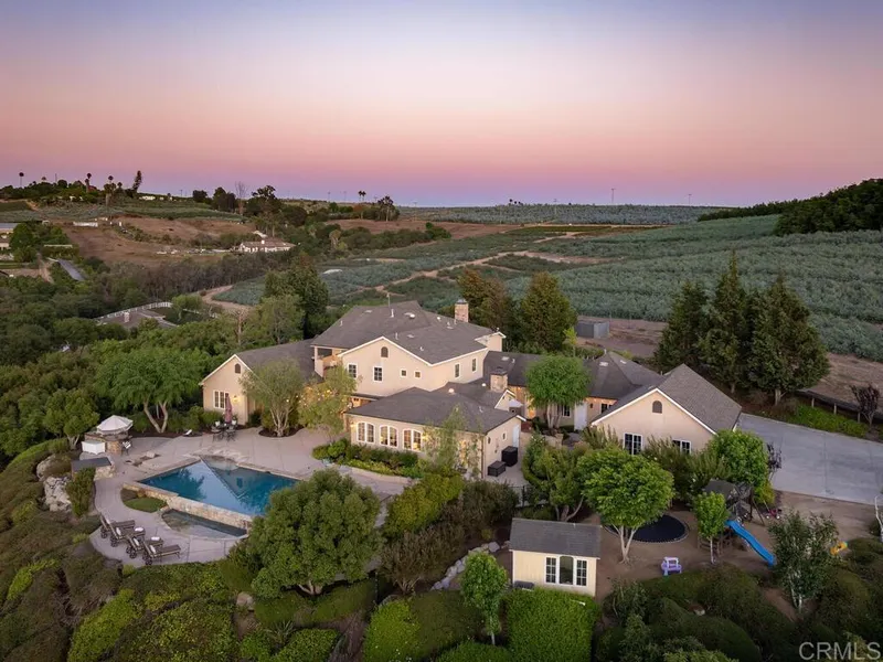 A French Country Haven in the Heart of Bonsall Experience timeless European charm blended with modern California luxury in this exquisite French Country estate, gracefully positioned on 2.5 acres in the scenic hills of Bonsall, California. Offering over 5,700 square feet of elegant living space with five bedrooms and six bathrooms, this residence captures the essence of Southern California countryside living—peaceful, sophisticated, and endlessly inviting. Upon arrival, a grand stone entryway welcomes you to interiors that balance classic craftsmanship with contemporary comfort. The main-level primary suite is a tranquil retreat, complete with a cozy fireplace, spa-inspired bath, spacious walk-in closet, and an additional flex room—perfect for a home office, gym, or art studio. At the heart of the home lies a gourmet chef’s kitchen, showcasing a Wolf commercial range, Sub-Zero refrigerator, and dual Miele dishwashers. Entertain with ease in the adjoining dining area beside a stacked stone fireplace, or explore the 330-bottle wine room designed for the true connoisseur. This property delights with both creativity and comfort—featuring a hidden room, a custom treehouse, an in-ground trampoline, and a private play area for recreation and relaxation. Every detail has been thoughtfully curated, from motorized shades and upgraded lighting to an advanced smart water system and tankless technology. Outdoors, discover resort-style living surrounded by breathtaking panoramic views. A saltwater lap pool with a vanishing edge and beach entry invites you to unwind under the Bonsall sky. The outdoor kitchen, courtyard, and reflecting pond set the scene for al fresco dining and sunset gatherings. Designed for today’s discerning homeowner, this estate also includes a 4-car garage, 48 owned solar panels with dual inverters, solar-heated pool, Nest-controlled HVAC, and whole-home water purification and monitoring systems—a masterful blend of luxury and sustainability. Adding to its unique appeal, approximately 170 mature Certified ORGANIC Hass avocado trees produce a harvest each year, offering an opportunity for eco-conscious living and a touch of California’s agricultural heritage. This extraordinary Bonsall luxury home is more than a residence—it’s an inspired lifestyle, where elegance, efficiency, and natural beauty live in perfect harmony.
