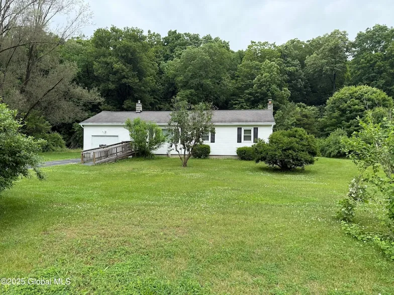 Snuggled on 2.53 beautiful acres, this 3 bedroom, 1 full bath ranch was built in 1980 with a gorgeous flat level yard. A cute kitchen with lots of cabinets and new refrigerator. You can do dishes and look out the window and be happy that you are alive. The kitchen is flanked with the dining area and opens to the living room with handsome wood floor. The full bath has been remodeled and shows very nicely. The full basement has a water softner and a wood stove hookup. One car garage (24x14) , paved drive, wheelchair ramp, 10x12 deck and lots of privacy in the back yard. 8 x 10 shed. A very clean home . Two bedrooms have new carpeting. Come take a look, you won't be disappointed.