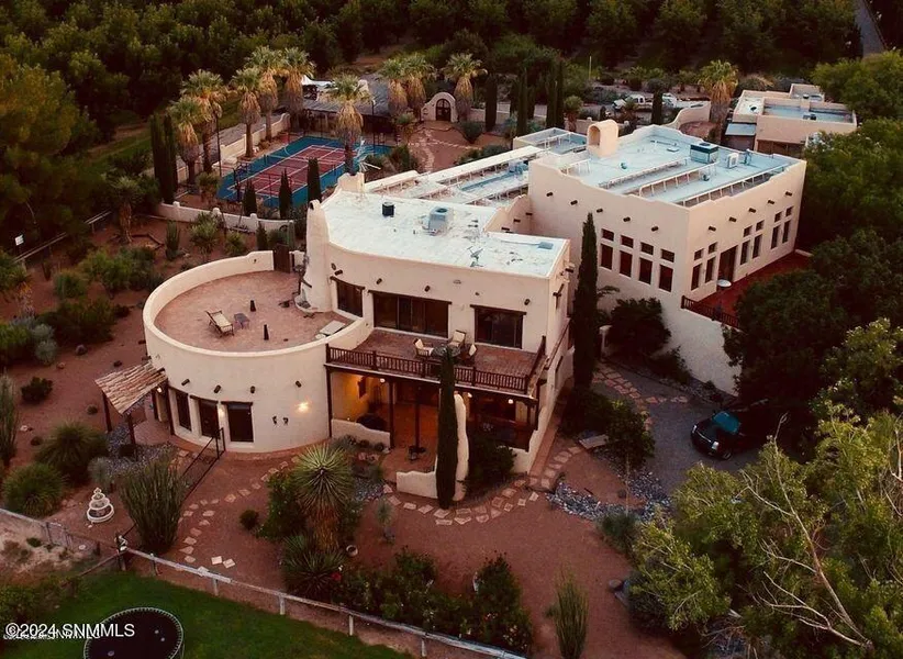 Discover an exceptional New Mexico estate nestled in the lush Mesilla Valley, boasting a grand 10,000 sqft primary residence. This secluded sanctuary offers a wealth of amenities tailored for luxurious living. Originally constructed in 1998, the two-story main residence underwent significant expansions in 2010, including a library, additional bedrooms, and a garage. The expansive 5 bedroom, 6 bathroom home is distinguished by its robust construction, featuring nearly two feet thick exterior walls composed of brick, concrete, and steel truss elements. Energy efficiency is paramount, starting with radiant floor heating and Pella windows, and culminating in an impressive 81-panel, 50.2 KW solar photovoltaic system that spans the roof. Inside, the residence epitomizes comfort and elegance, highlighted by a master ensuite complete with an exercise area, hot tub, and sauna. Situated on 2.5 acres of meticulously landscaped desert gardens, the estate also includes a tennis court and paddock, offering a perfect