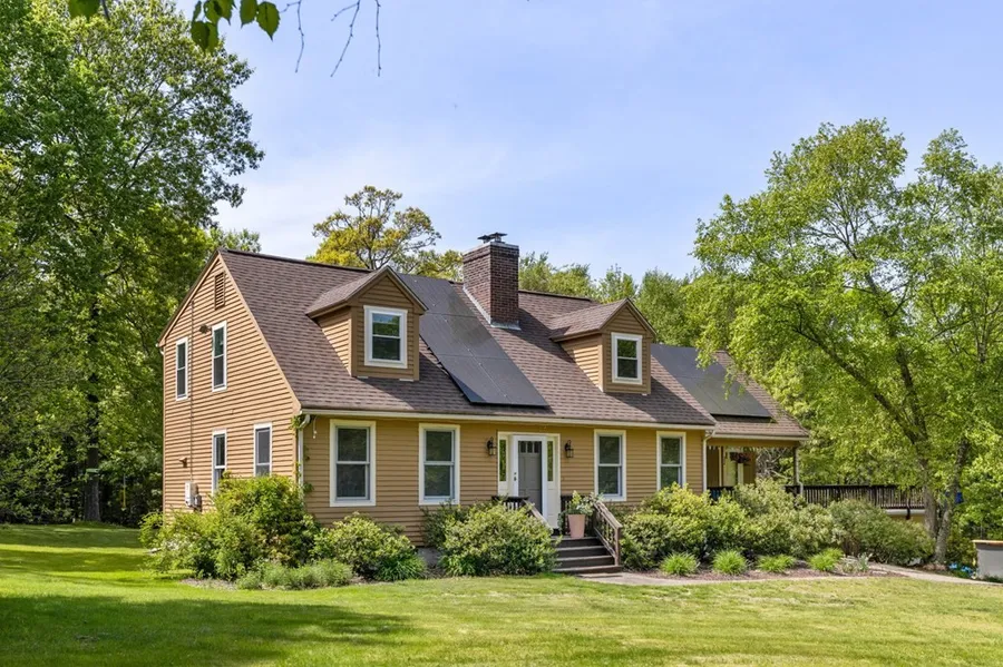 This Cape style home boasts a peaceful setting next to the Brimfield State Forest and set back from the road for wonderful privacy. Spend mornings relaxing and enjoying the birds chirping on the expansive farmers porch or one of two decks. The open floor plan layout for a great flow and loads of natural sunlight. Wait until you see the fabulous kitchen with newly replaced cabinet fronts and ample counter space. There are wide pine floors, stainless steel appliances and an a wonderful eating area. The family room has a fantastic wood burning stove and there is an additional playroom/office. There are 3 bedrooms and 2 full bathrooms. Many updates include roof , kitchen and hot water tank (2019) second floor windows and garage door (2020). Title V in hand. Move in ready.