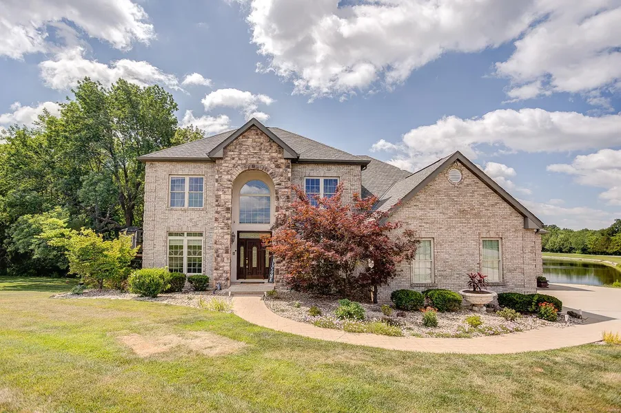 Gorgeous Atrium two story with beautiful view of the lake with over 5,000 square feet of living space. Corner lot with circle drive and 4 car attached garage. Enter inside into all the luxuries throughout, blond hickory flooring, curved entry staircase with elegant spindles, the den/office to the left and dining room to the right, opens to the large open living area with built in cabinets adorning the gas fireplace and the kitchen with white cabinets, granite countertops, stainless steel appliances, double oven, walk in pantry and laundry room. The upper floor is where you will find all the sleeping quarters, the 24x16 master ensuite with seating area, and its own quiet deck, master bath includes double sink bath with whirlpool, separate shower and large walk in closet, and three other generously sized bedrooms, with plenty of bathrooms. The lower level holds its very own Koi pond, a fireplace, kitchen area, large family rec area and plenty of storage space with a walk up.